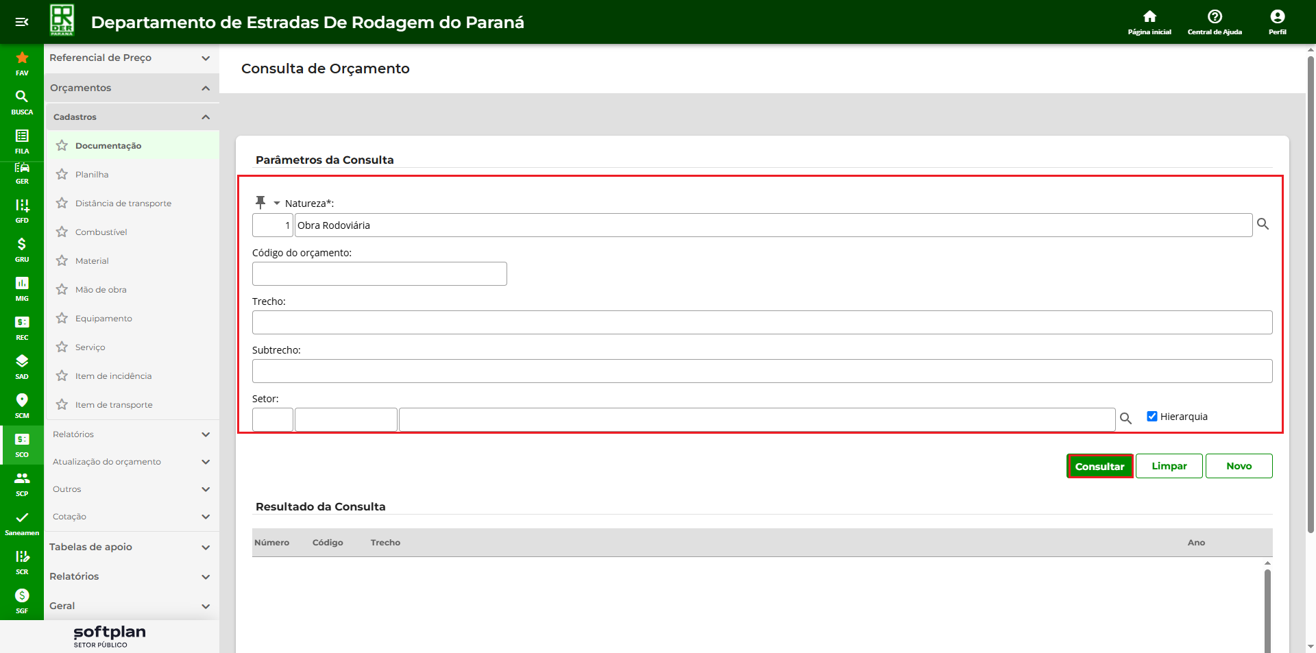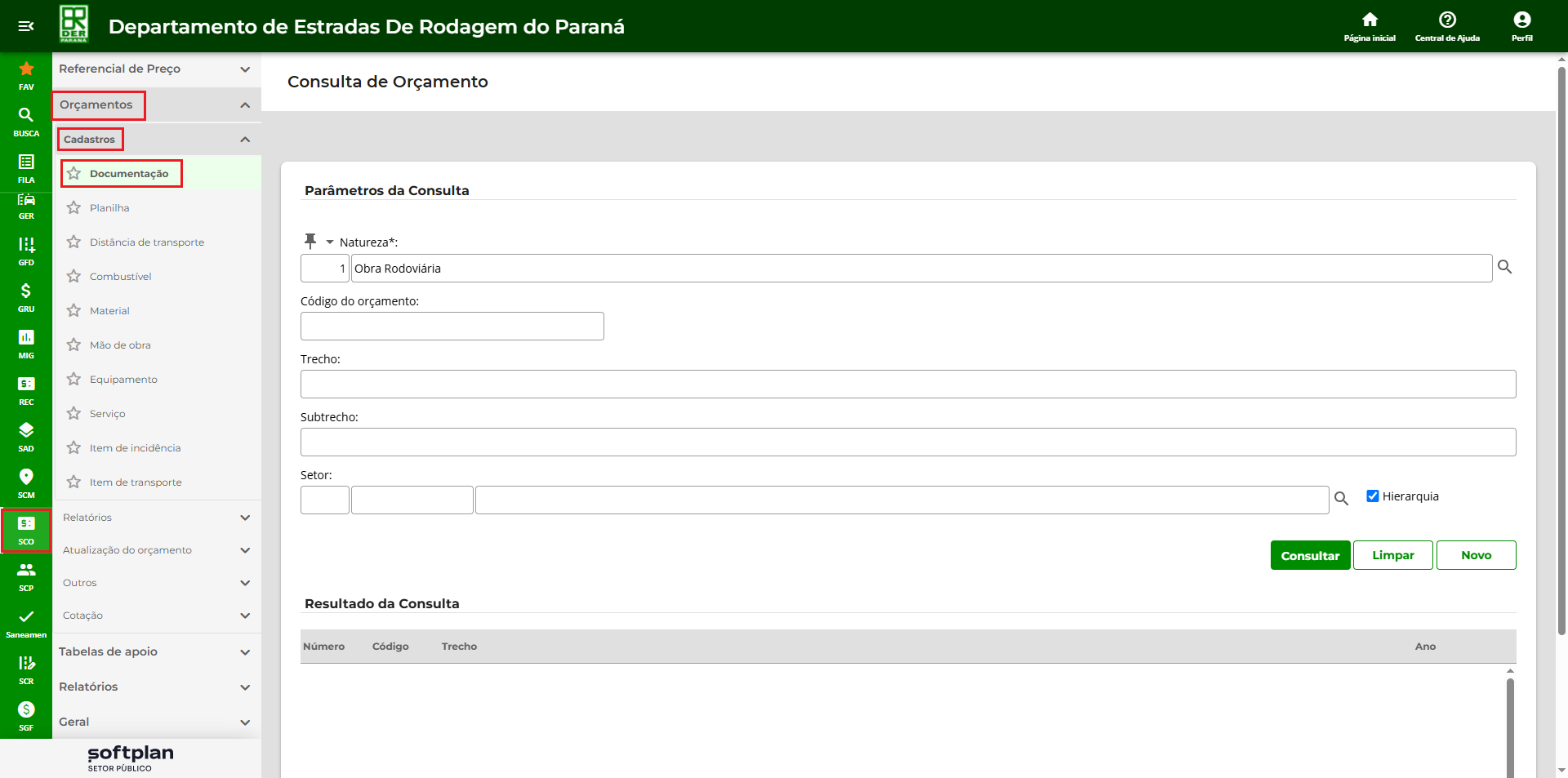 1 – No módulo SCO, acesse o menu ‘Orçamentos’, o submenu ‘Cadastros’ e, em seguida, a funcionalidade ‘Documentação’.