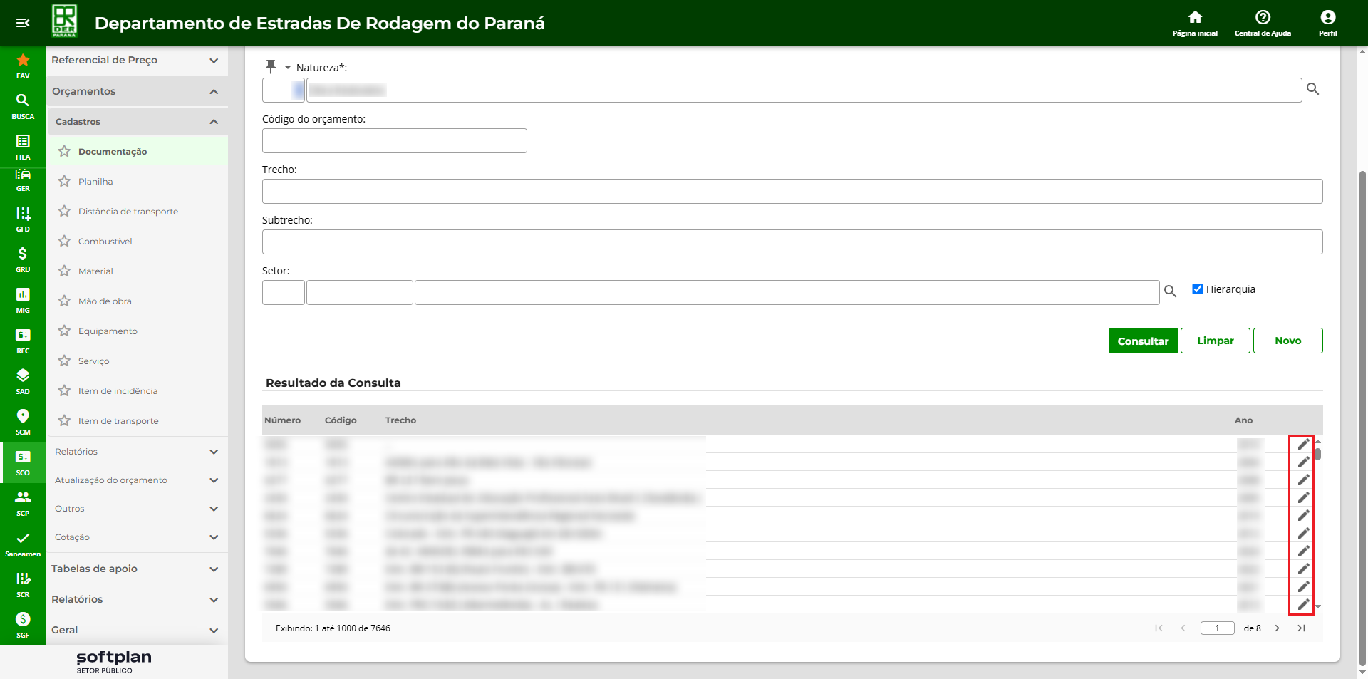 3 – Localize o orçamento desejado em ‘Resultado da Consulta’ e clique no ícone de “lápis” para editar.