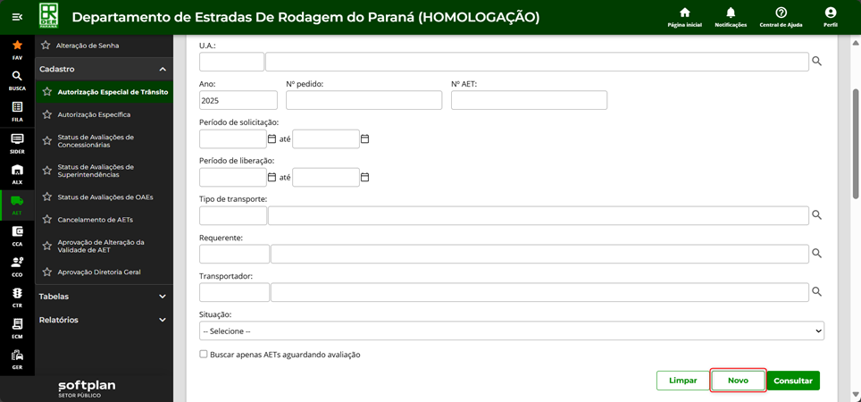 Passo 2: na tela de ‘Consulta de AETs’, clique no botão ‘Novo’ para abrir a tela de cadastro.
