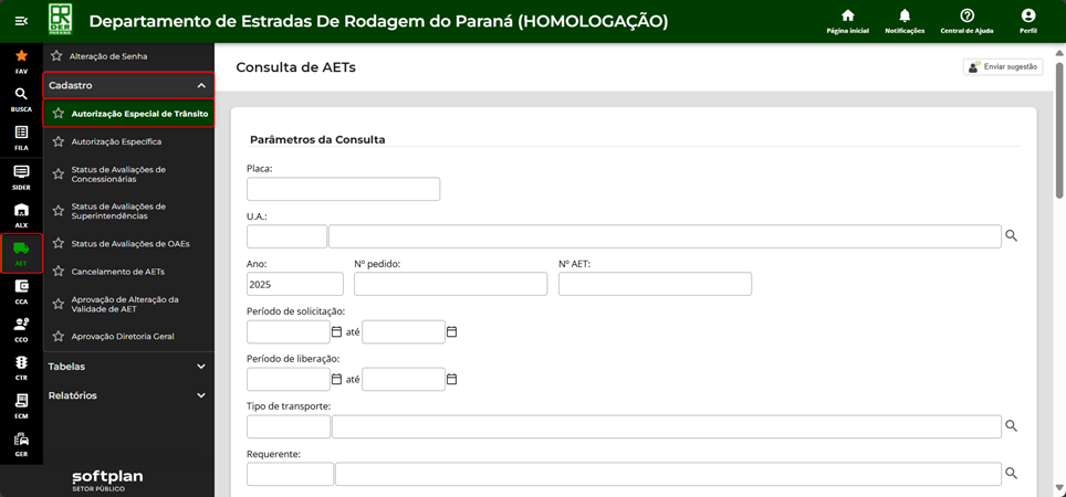 Passo 1: no módulo ‘AET’, acesse o menu ‘Cadastro’ e clique na funcionalidade ‘Autorização Especial de Trânsito’.