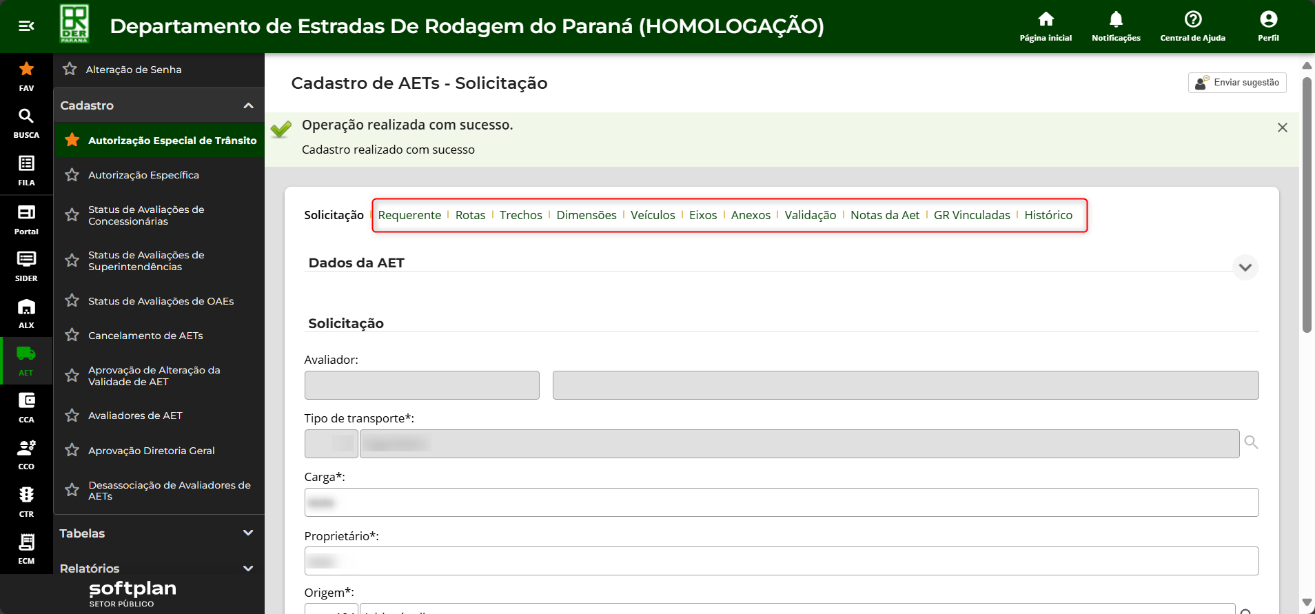 No cadastro de AET, além da possibilidade de avaliação e validação das AETs encaminhadas pelos requerentes, também é possível realizar o cadastramento de uma nova AET, para alguma eventualidade. Através desta tela de cadastro de AET, o sistema disponibiliza de forma completa as informações solicitadas na AET. As informações da AET estão dispostas nas diferentes abas da tela de cadastro e poderão ser visualizadas ao navegar entre elas.