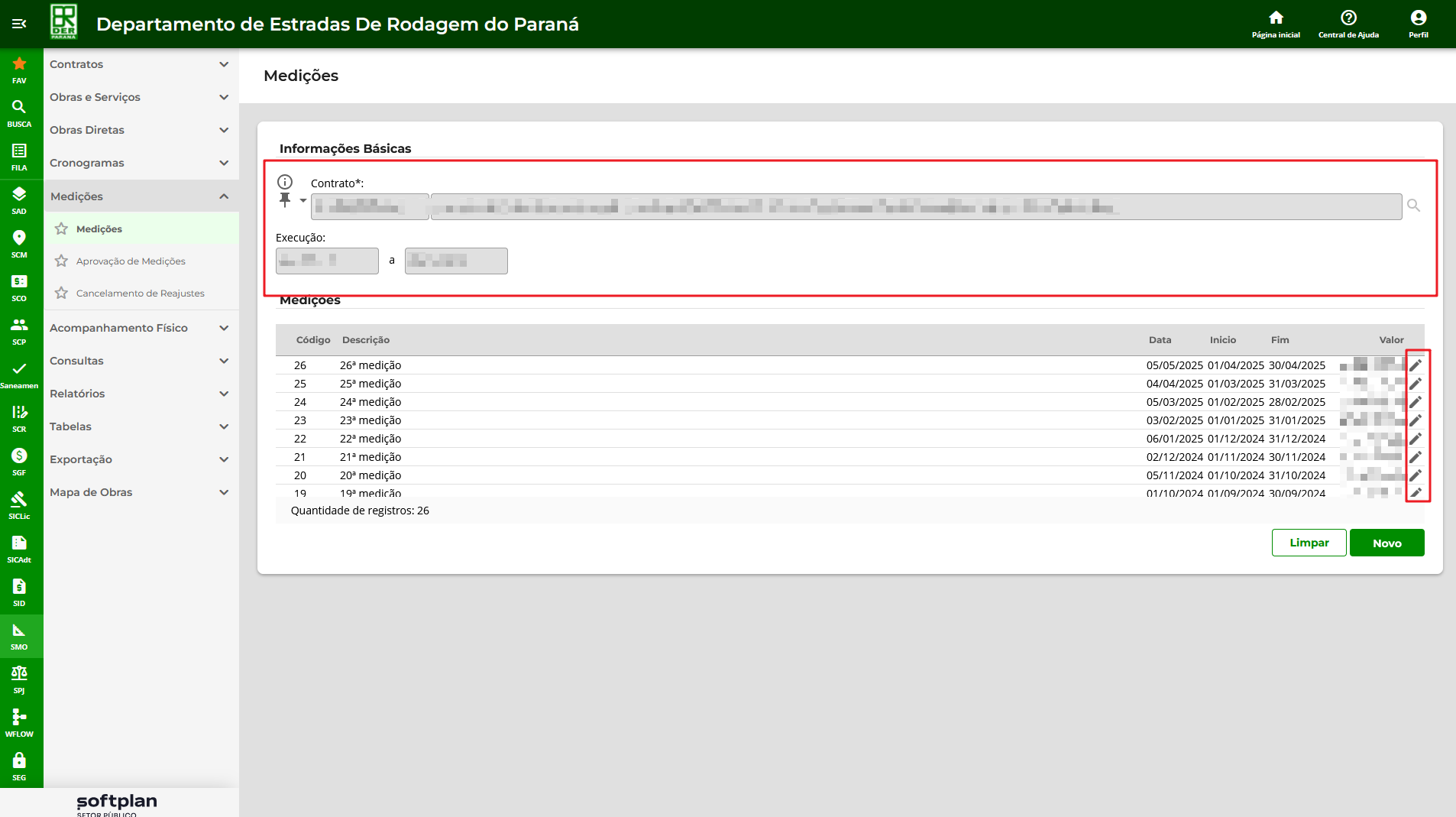 2 – Preencha o campo ‘Contrato’ ou clique no ícone de “lupa” para buscá-lo e, em seguida, clique no ícone de “lápis” para editar a medição.
