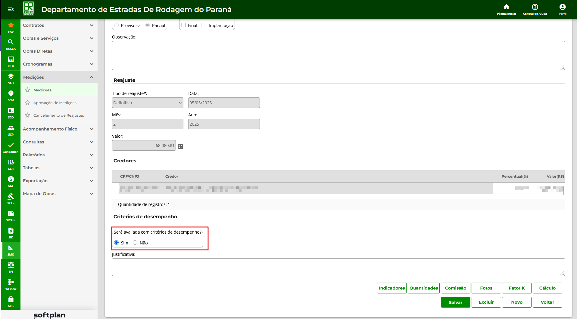 ❗É possível preencher a avaliação de desempenho da medição para cada item de desempenho vinculado ao contrato e ao grupo de serviço.
