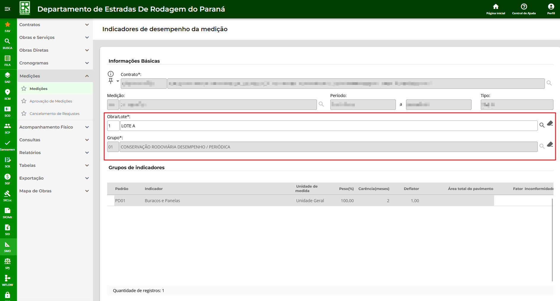 4 – Preencha os campos ‘Obras/Lote’ e Grupo manualmente ou clicando no ícone de “lupa”.