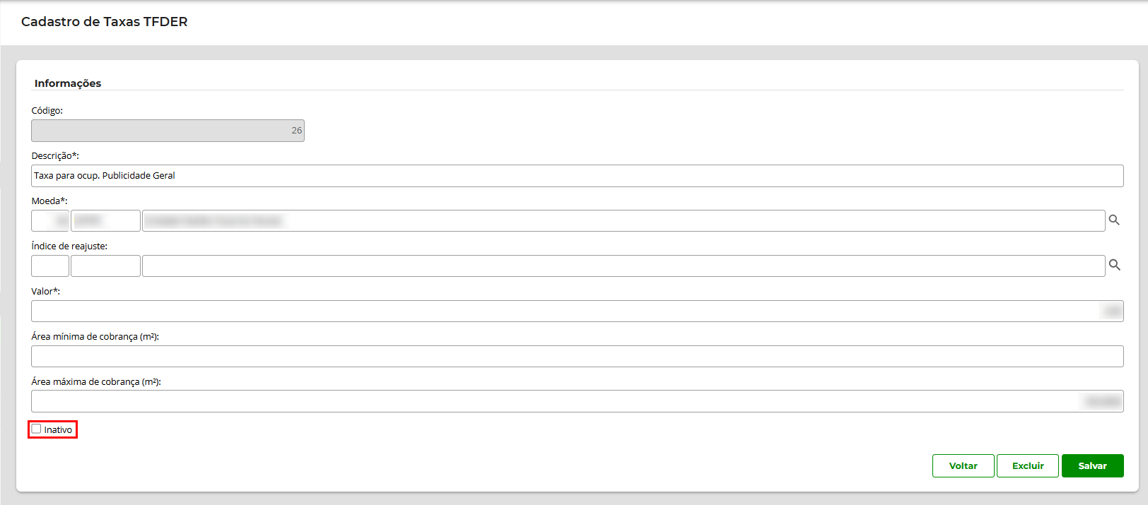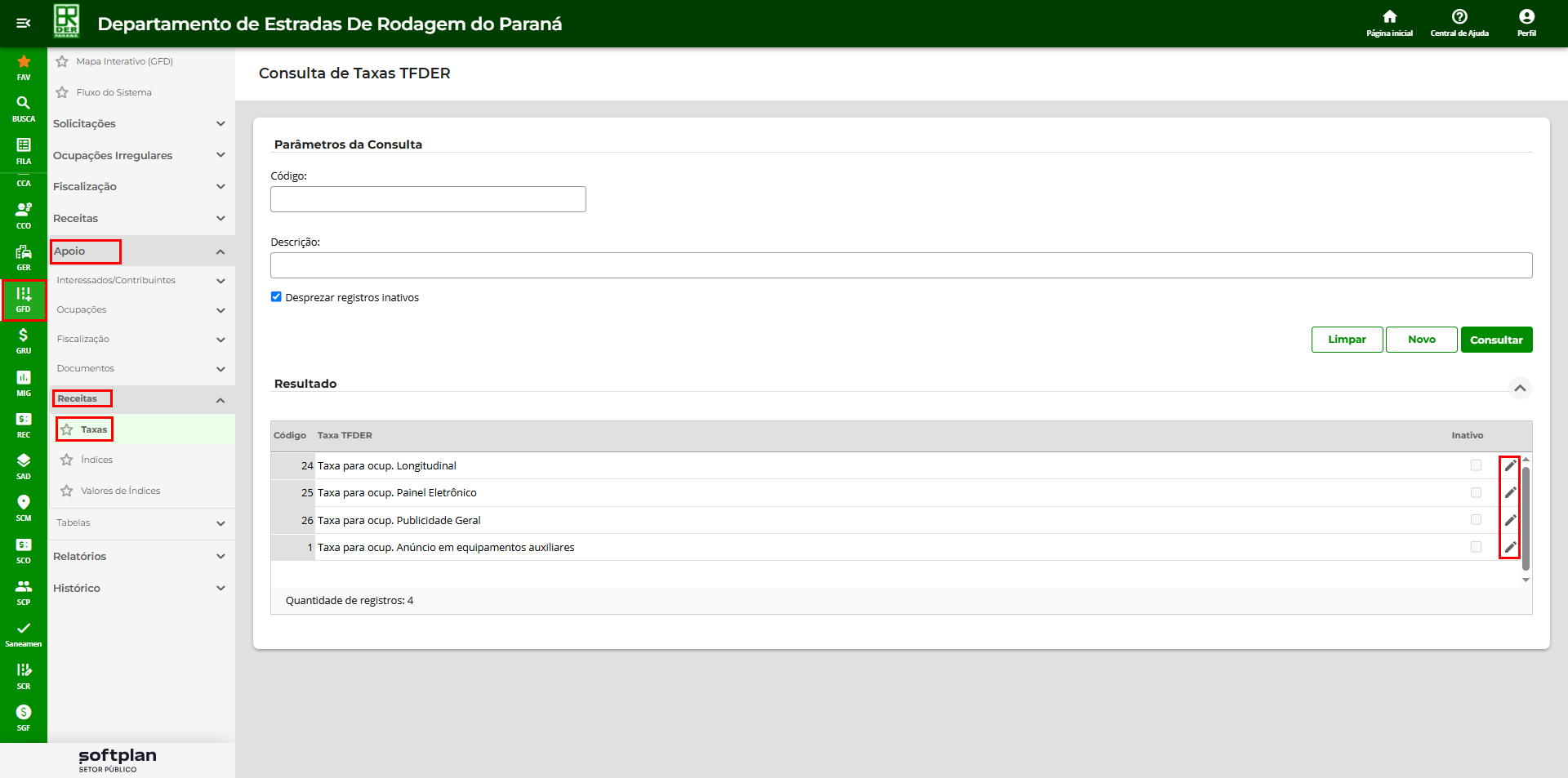 Esta funcionalidade serve para configurar os valores de taxas para a fiscalização das faixas de domínio de rodovias sob circunscrição do DER/PR, tanto para ocupações pontuais quanto para ocupações longitudinais e transversais.