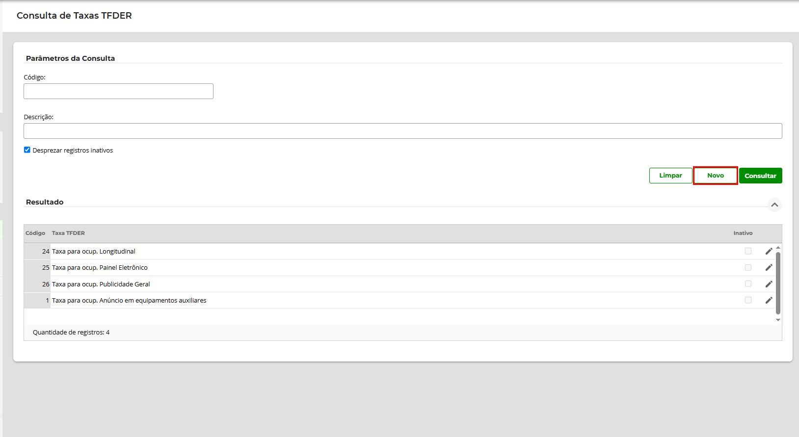 2 – Ao acessar a funcionalidade, será apresentada a tela de consulta. Aqui informe o código e/ou a descrição de um registro de taxa para buscá-lo no sistema, e clique em ‘Consultar’ para trazer os resultados encontrados.