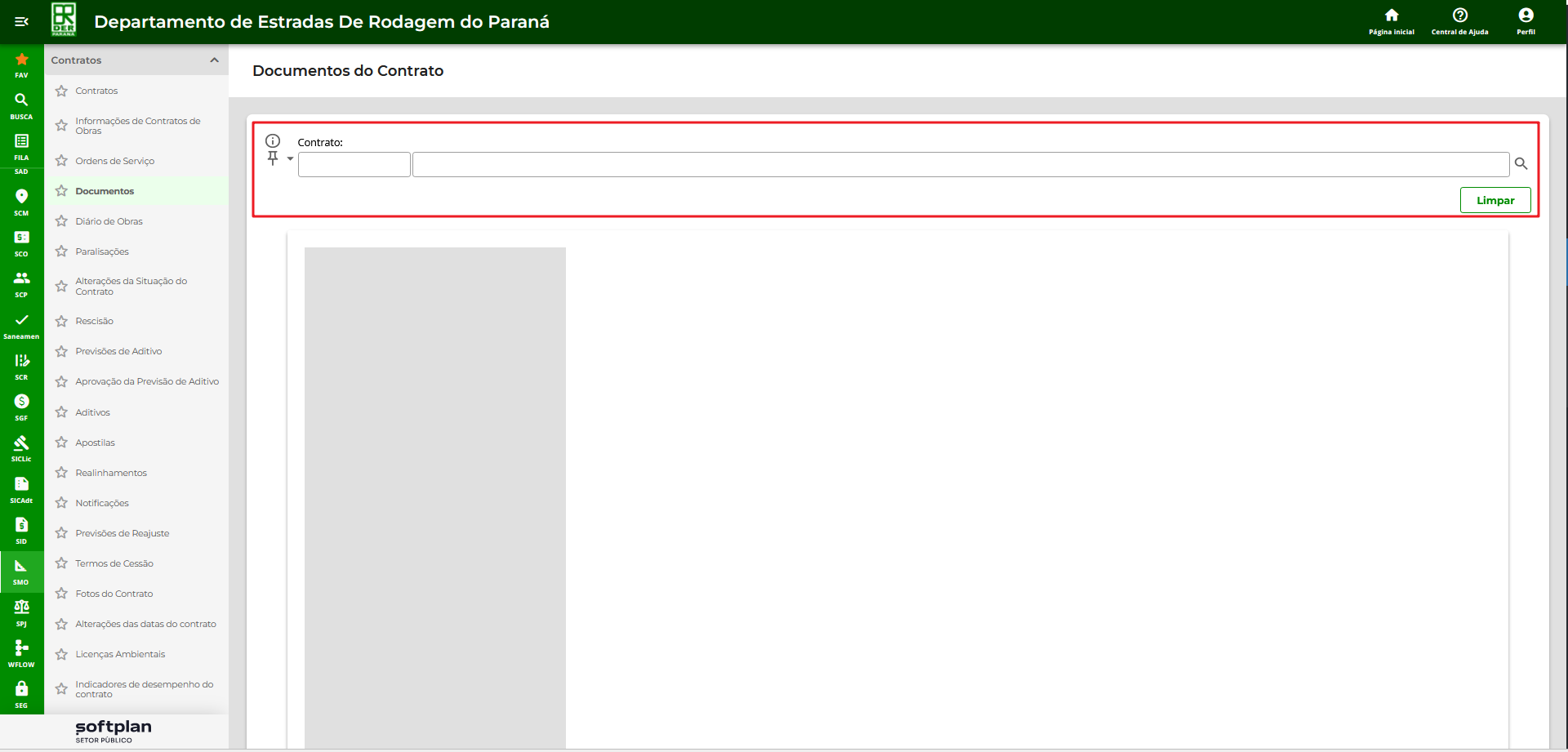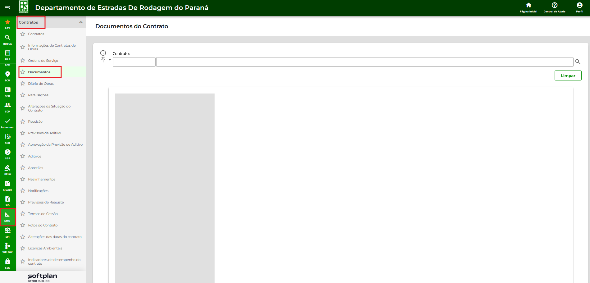 1 – No módulo ‘SMO – Gestão de Contratos e Medições’, acesse o menu ‘Contratos’, clique na funcionalidade ‘Documentos’.