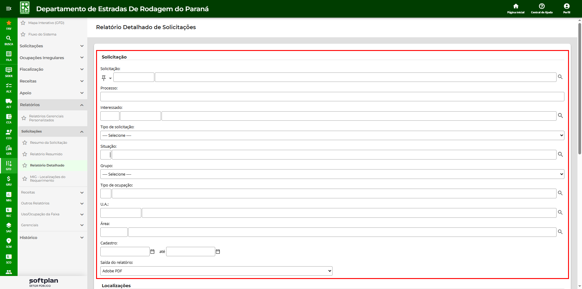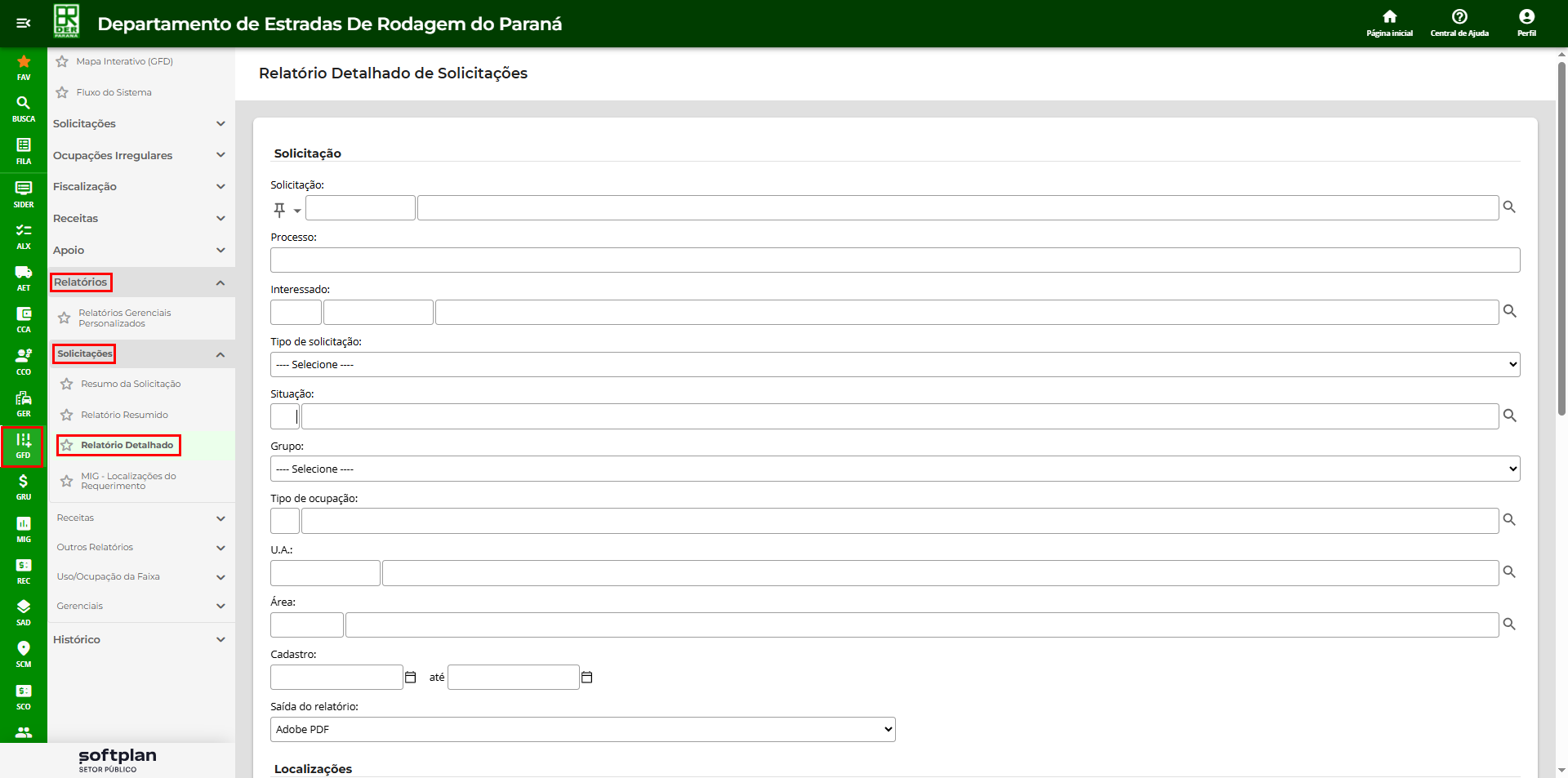 1 – No módulo ‘GFD – Faixa de Domínio’, menu ‘Relatórios’, submenu ‘Solicitações’, e clique na funcionalidade ‘Relatório Detalhado’.