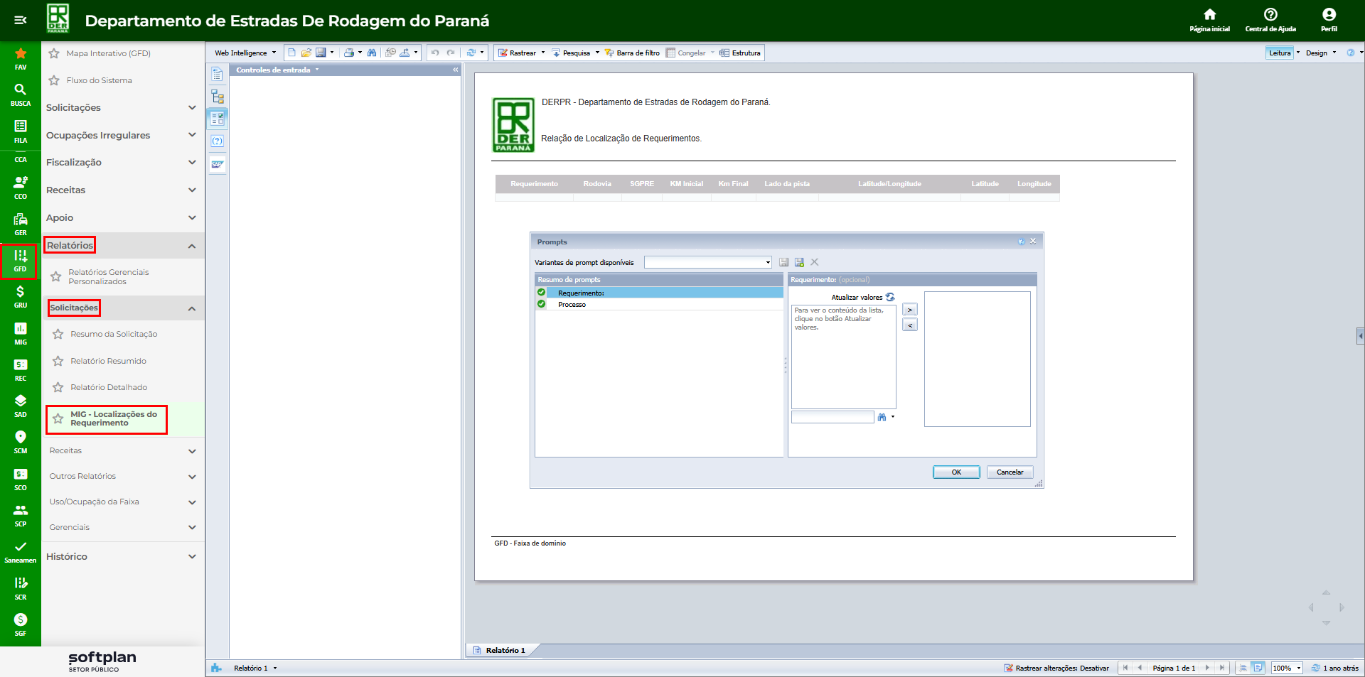1 – No módulo GFD, acesse o menu ‘Relatórios’ e clique na opção ‘Solicitações’ e em seguida no menu ‘MIG – Localizações do Requerimento’.