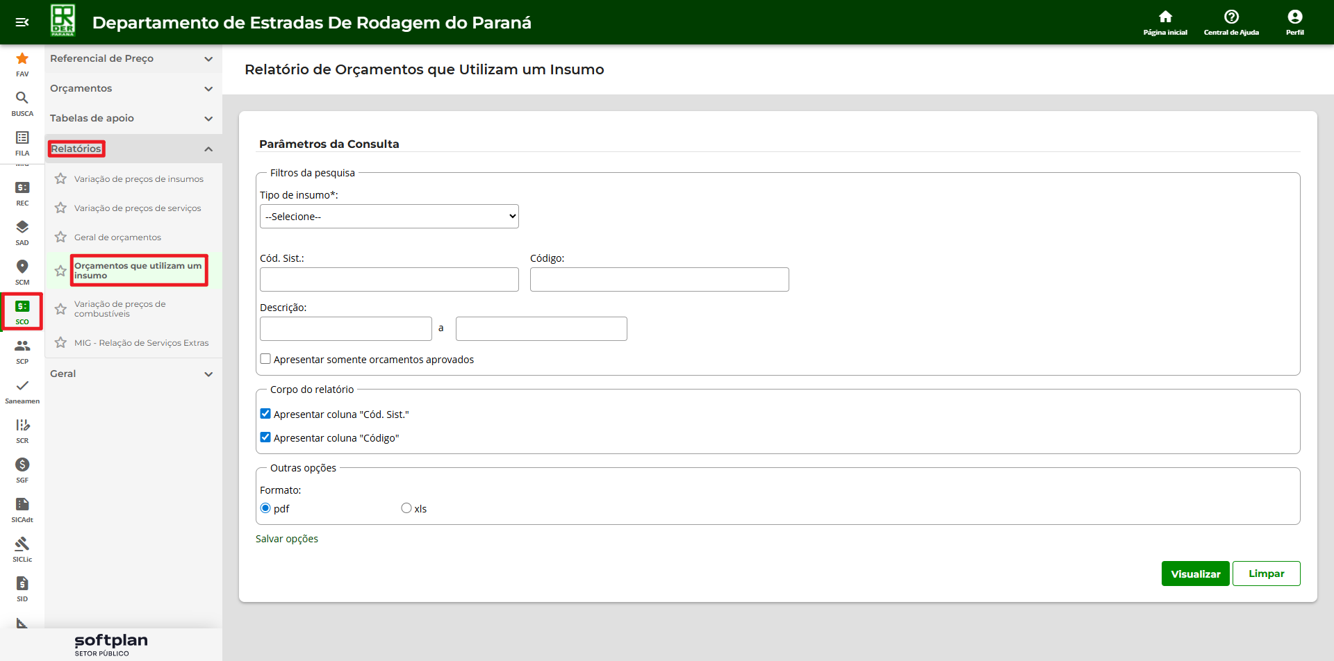 1 – No módulo SCO, acesse o menu ‘Relatórios’ e clique na opção ‘Orçamentos que utilizam um insumo’.