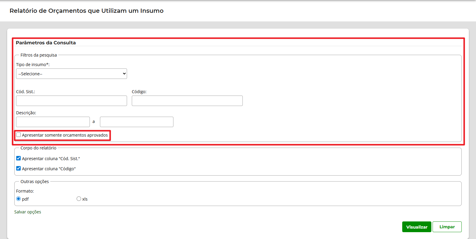 2 – Na tela, preencha os filtros de pesquisa, e posteriormente selecione a caixa de seleção, caso opte por considerar somente os orçamentos aprovados ao invés de considerar todos os orçamentos.