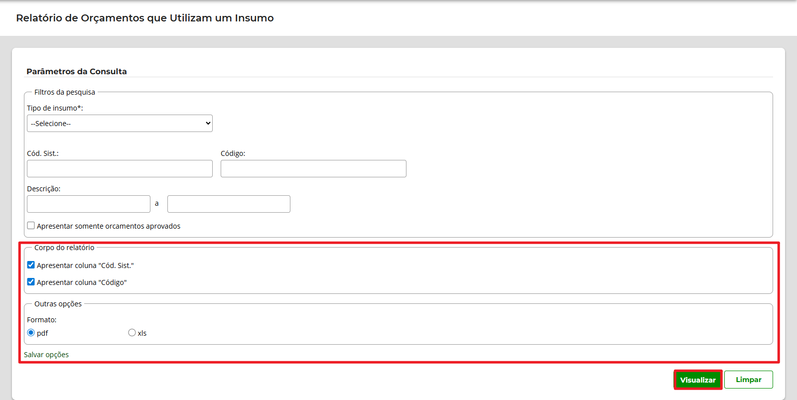 Como emitir um relatório de orçamentos que utilizam um insumo?