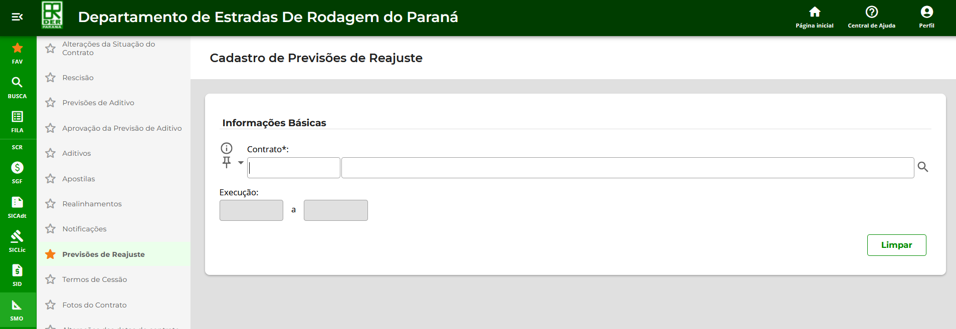 Passo 1: no módulo ‘SMO – Gestão de Contratos e Medições’, acesse o menu ‘Contratos’ e clique na funcionalidade ‘Previsões de Reajuste’, e na tela de ‘Cadastro de Previsões de Reajuste’ clique no ícone de “lupa”.