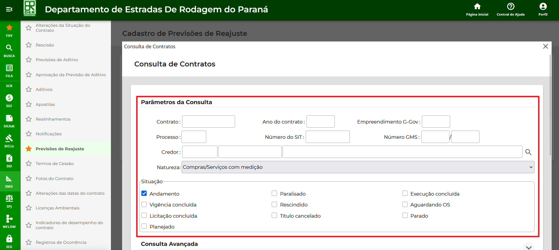 Passo 2: na janela de consulta, preencha ao menos um filtro e clique em ‘Consultar’.