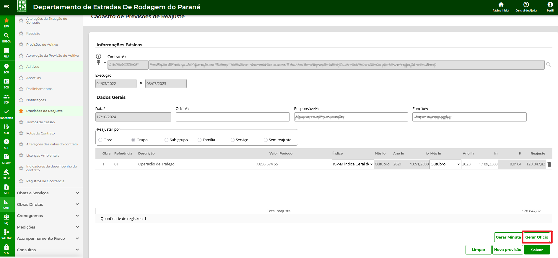 Passo 4: com o contrato aberto, acione o botão ‘Gerar Ofício’ para finalizar.