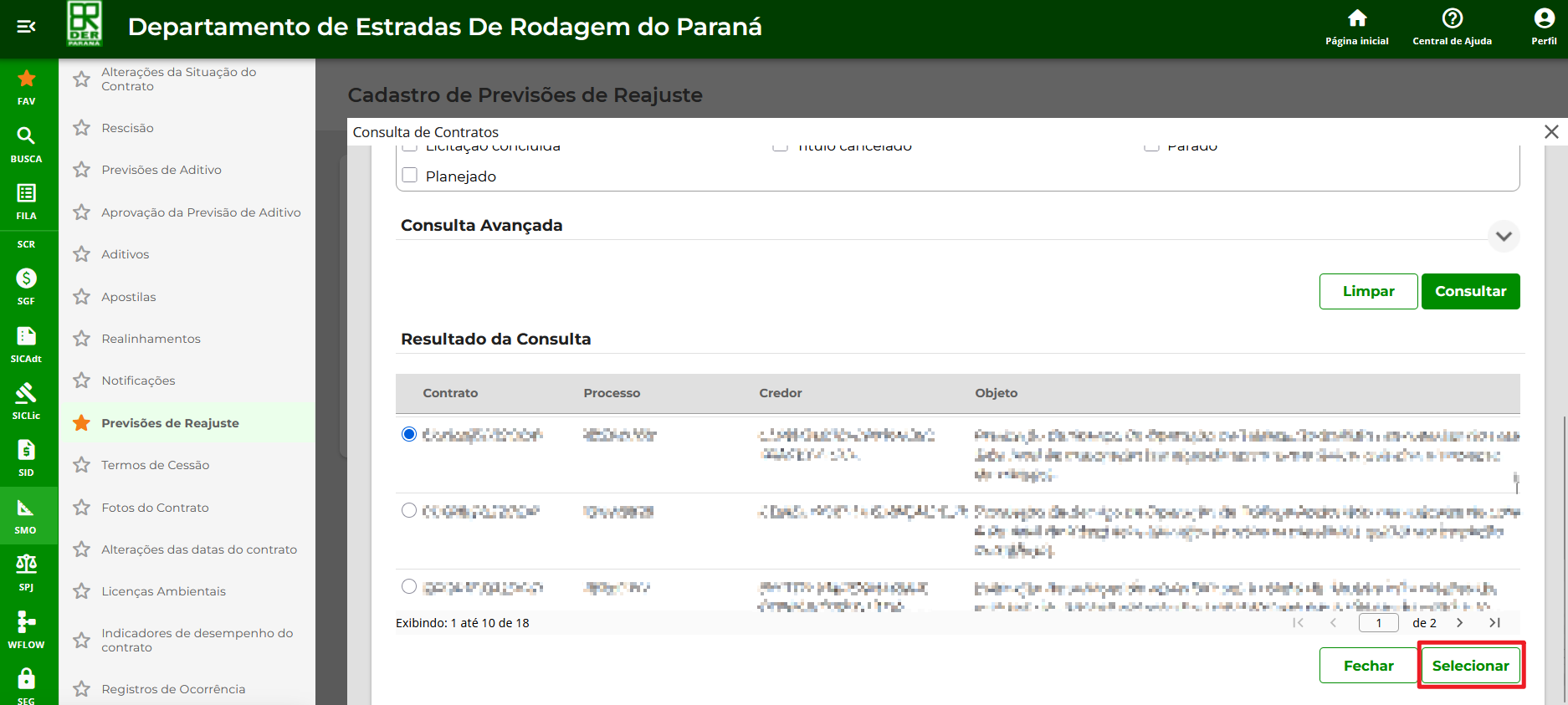 Passo 3: na tabela de ‘Resultado da Consulta’ selecione o contrato e acione o botão ‘Selecionar’ para abri-lo.