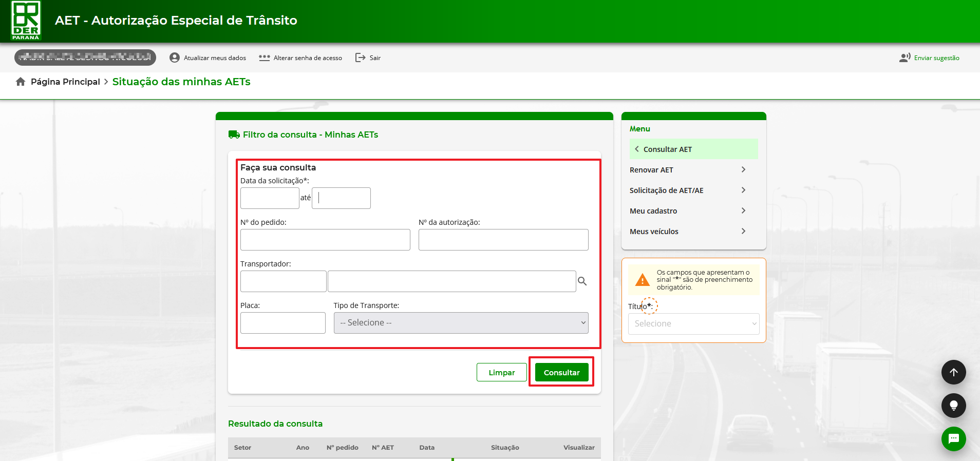 1 – Após realizar o login, na tela de consulta, preencha os filtros e clique em ‘consultar’ para buscar a AET.