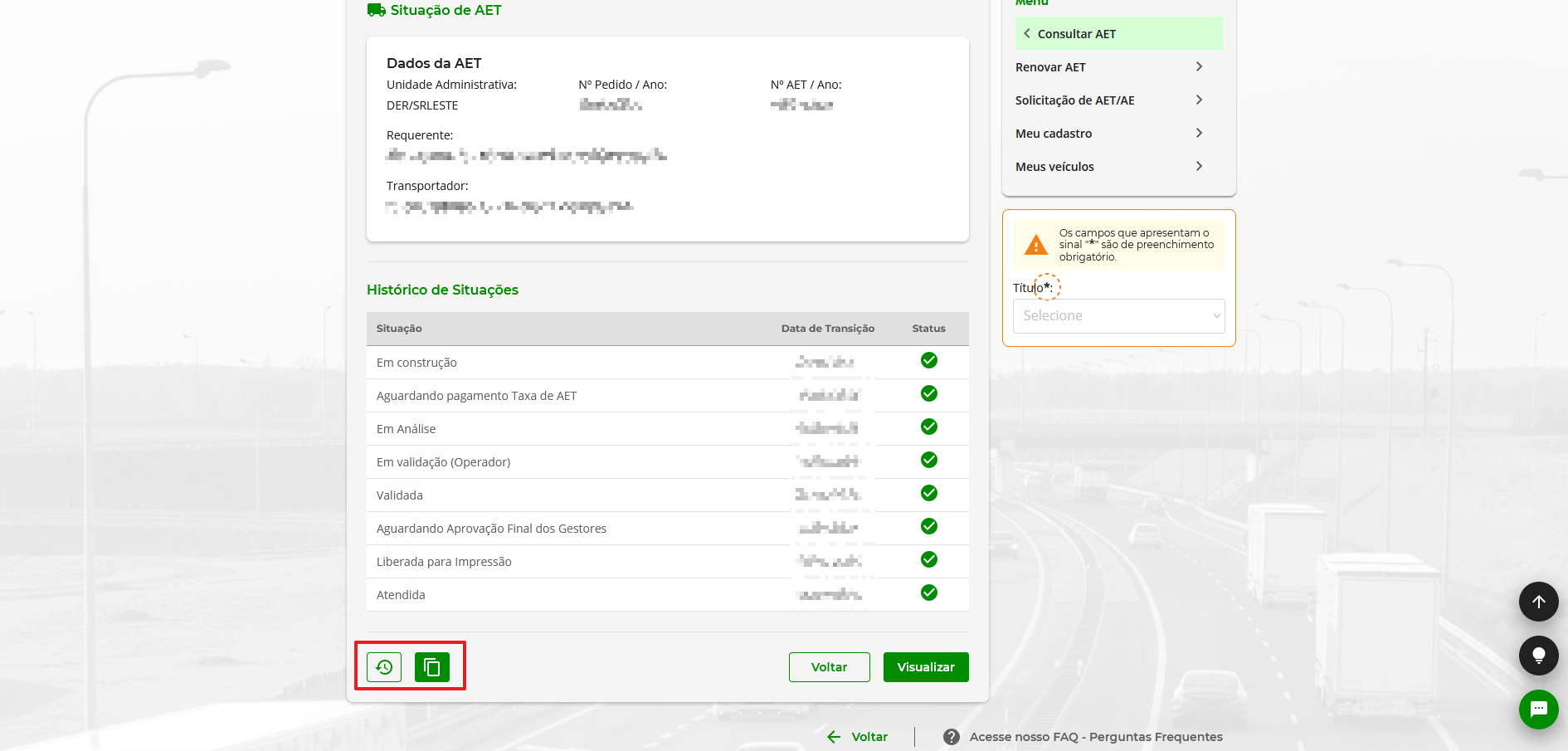 2 – Após isso, ao clicar em ‘VISUALIZAR’ será apresentado para visualização todas as informações da AET, sem possibilidade de edição dos dados. O botão ‘Copiar requerimento de AET’ é possível ao requerente realizar uma cópia idêntica da AET, gerando um novo pedido que será apresentado em construção para que o requerente realize apenas as alterações necessárias no novo pedido, como por exemplo: data de validade.