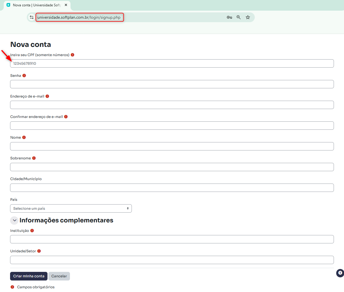 Abra o link https://universidade.softplan.com.br/login/signup.php para se cadastrar na plataforma.