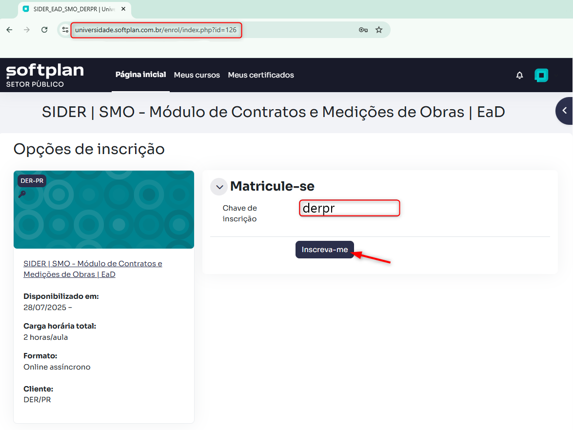 Ao acessar o curso pela primeira vez, será solicitado o uso de uma chave de inscrição. Digite a seguinte chave de acesso: derpr