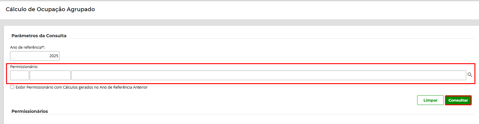 ❗É possível a realização dos cálculos anuais de ocupação das faixas de domínio de forma agrupada por permissionário, ou seja, é emitido a cada ano um único cálculo para cada permissionário considerando todas as ocupações autorizadas, de acordo com as solicitações de uso/ocupação registradas no sistema.