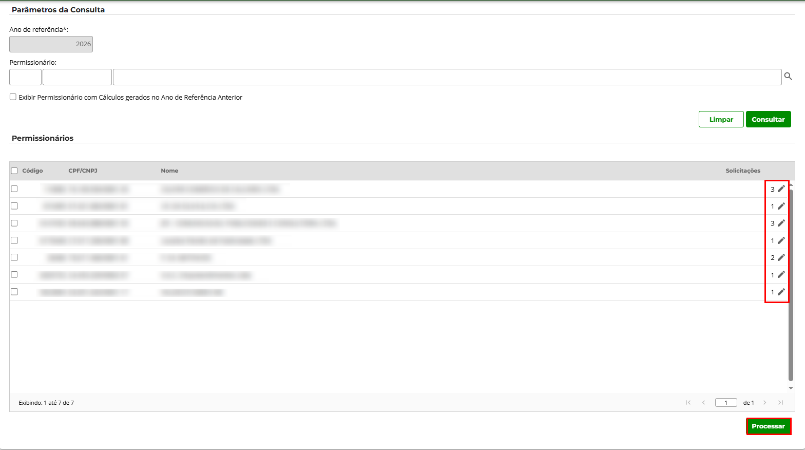 3 – Selecione os permissionários ao qual deseja realizar o cálculo, e clique em ‘Processar’.