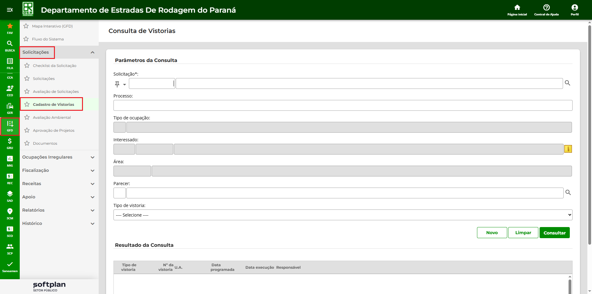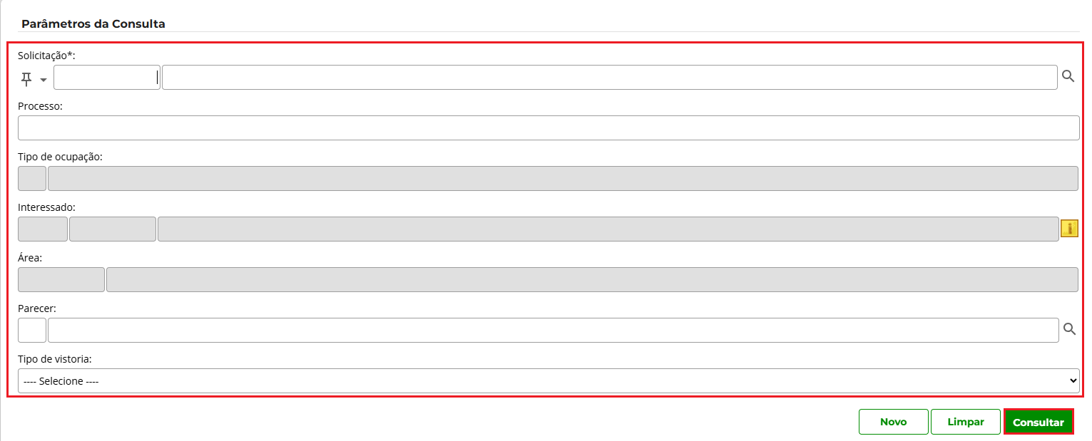 2 – Preencha os campos disponíveis como parâmetros da consulta e clique no botão ‘Consultar’.