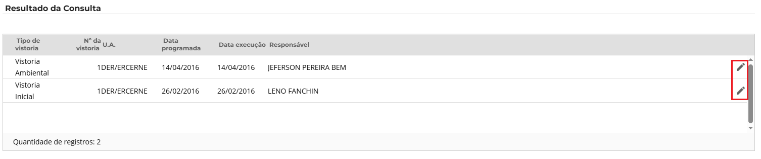 3 – Na tabela de resultados, procure pelo registro da vistoria em questão e selecione a solicitação.