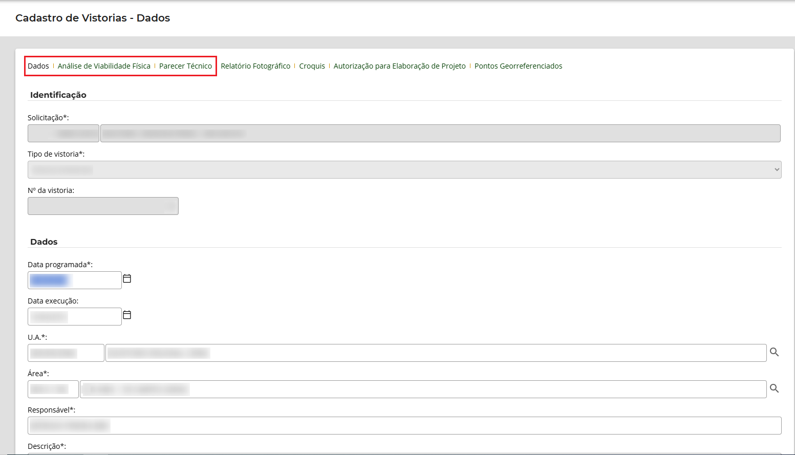 4 – Faça as edições necessárias e, na tela de cadastro, preencha as informações nas abas ‘Dados’, ‘Análise de Viabilidade Física’ e ‘Parecer Técnico’.