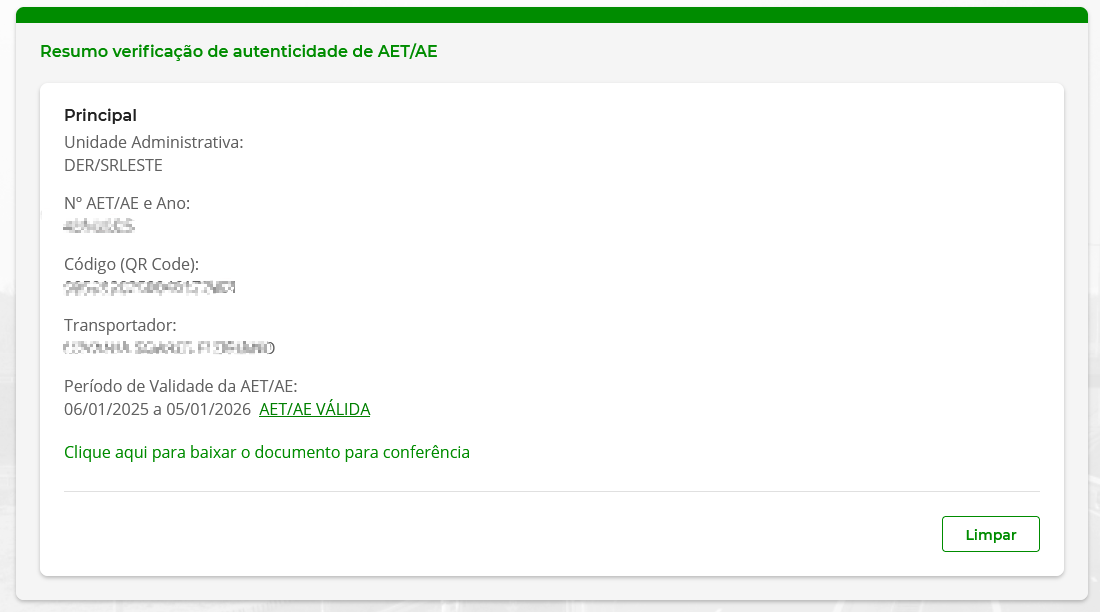 3 – Ao clicar em ‘Consultar’ será apresentado o resumo das informações da AET/AE relacionadas ao código