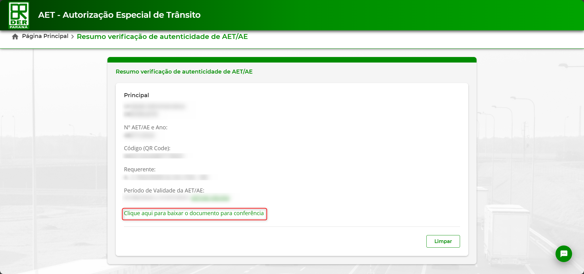 3 – Na tela de ‘Resumo de verificação de autenticidade de AET/AE’, acione o botão ‘Clique aqui para baixar o documento para conferência’ para realizar o download do documento.